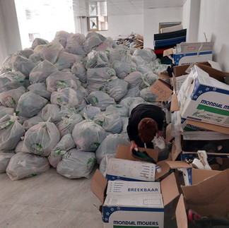 We gaan door totdat het te donker wordt. Reijer vindt zijn eigen schoenen, Heleen de nodige kleding die bij haar uit de kast komt en ook Martin de spellen die op school zijn gemaakt. Mooi al die herkenning. Het loopt als een trein en binnen de korte keren zijn er een paar honderd zakken gevuld. Louis heeft inmiddels een voetbalshirt, spel en nieuwe schoenen in de tas⦠Johanna wil graag, ook als het donker is, dat we doorgaan. Dan met de zaklamp van de telefoons verder, totdat alle zakken op zijn. Er ligt inmiddels een partij van ongeveer 1700 zakken.